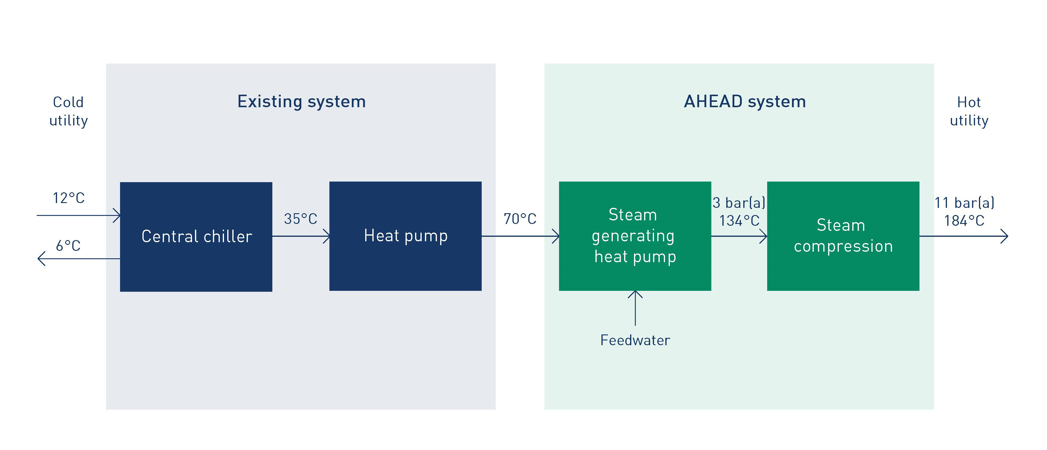 In the future, AHEAD will use the existing heat from the heating water system to generate steam through another dedicated heat pump. The technical challenge here is that there may be thermal problems in the compressor or problems with the chiller oil due to the high temperatures. Also, most conventional refrigerants cannot be used for such high temperatures. SPH Sustainable Process Heat GmbH has already developed a heat pump that can deliver up to 165°C and is based on a reciprocating compressor. This heat pump is now being adapted to use natural refrigerants to first heat the heating water from 65 to about 130°C, evaporating it in the process. This vapor will be compressed to 11 bar, heating it to over 184°C, as required for pharmaceutical production.