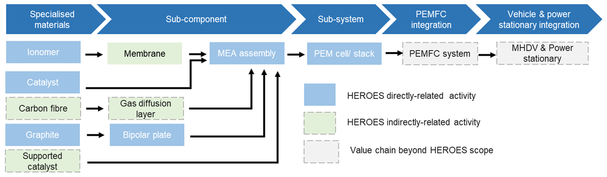 Figure 1. HEROES activities on materials development according to the PEMFC value chain.
