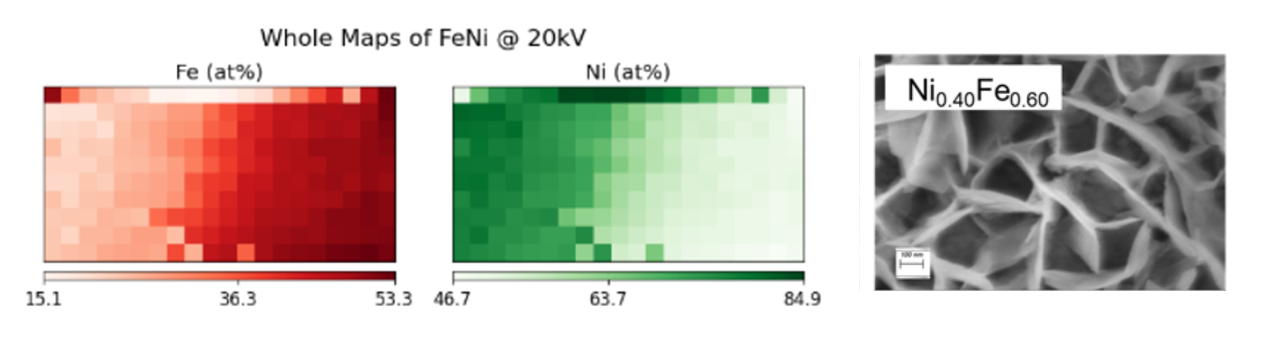 Figure 1. (Left) Fe and Ni elemental compositional library on the NiFe-layered double hydroxide (LDH) deposited by combinatorial electrochemical deposition at AIT. (Right) A representative of NiFe-LDH deposited by electrochemical deposition from a sulfate-containing electrolyte.
