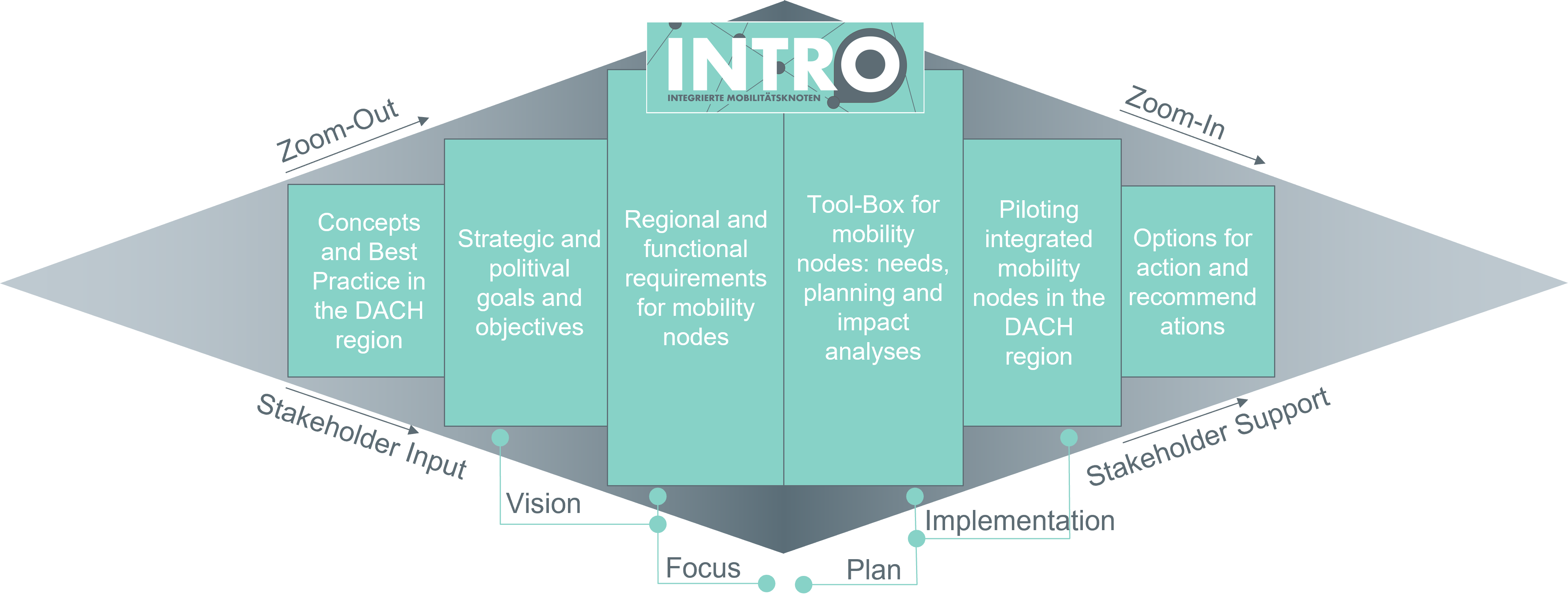 The present project INTRO (Integrierte Mobilitätsknoten) investigates the prerequisites and requirements for effective integrated mobility nodes and the modelling of potential demand for the DACH region. The trinational consortium consisting of the AIT Austrian Institute for Technology (Austria), the Planersocietät PG (Germany) and Rapp AG (Switzerland) is developing a toolbox for planning, demand and impact analyses as well as recommendations for action for the stakeholders in the INTRO project.