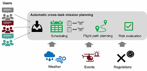 The objectives of the project are to demonstrate the functionality of cross-task mission planning for community drones in simulation, to evaluate the increase in efficiency and the economic potential, and to analyze the technical, organizational, and legal feasibility, as well as the framework conditions required for practical operation.