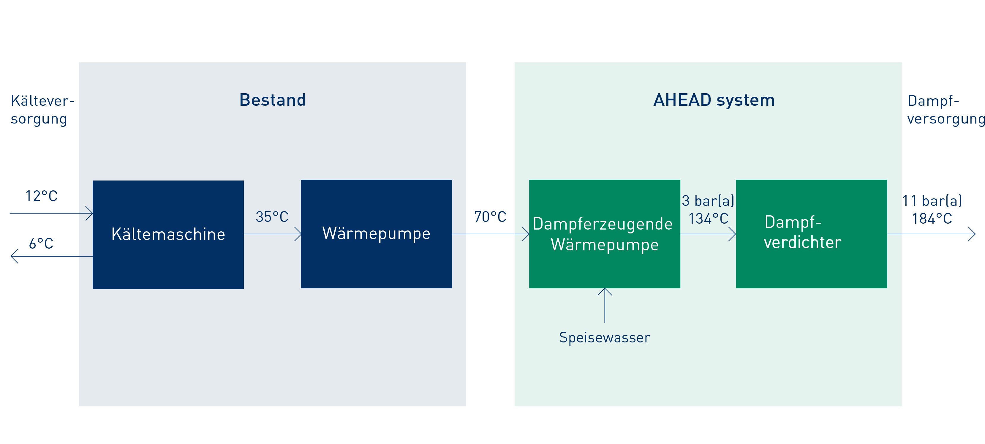 AHEAD wird in Zukunft die vorhandene Wärme des Heizungswassersystems durch eine weitere spezielle Wärmepumpe zur Dampferzeugung nutzen. Die technische Herausforderung dabei ist, dass es aufgrund der hohen Temperaturen zu thermischen Problemen im Verdichter oder Problemen mit dem Kältemaschinenöl kommen kann. Auch sind die meisten herkömmlichen Kältemittel nicht für so hohe Temperaturen verwendbar. SPH Sustainable Process Heat GmbH hat bereits eine Wärmepumpe entwickelt, die bis zu 165°C liefern kann und auf einem Kolbenverdichter beruht. Diese Wärmepumpe wird nun für den Einsatz natürlicher Kältemittel adaptiert, um so das Heizungswasser zuerst von 65 auf etwa 130°C zu erwärmen und dabei zu verdampfen. Dieser Dampf wird auf 11 bar verdichtet und dabei auf über 184°C erhitzt, so wie es für die Arzneimittelproduktion erforderlich ist.