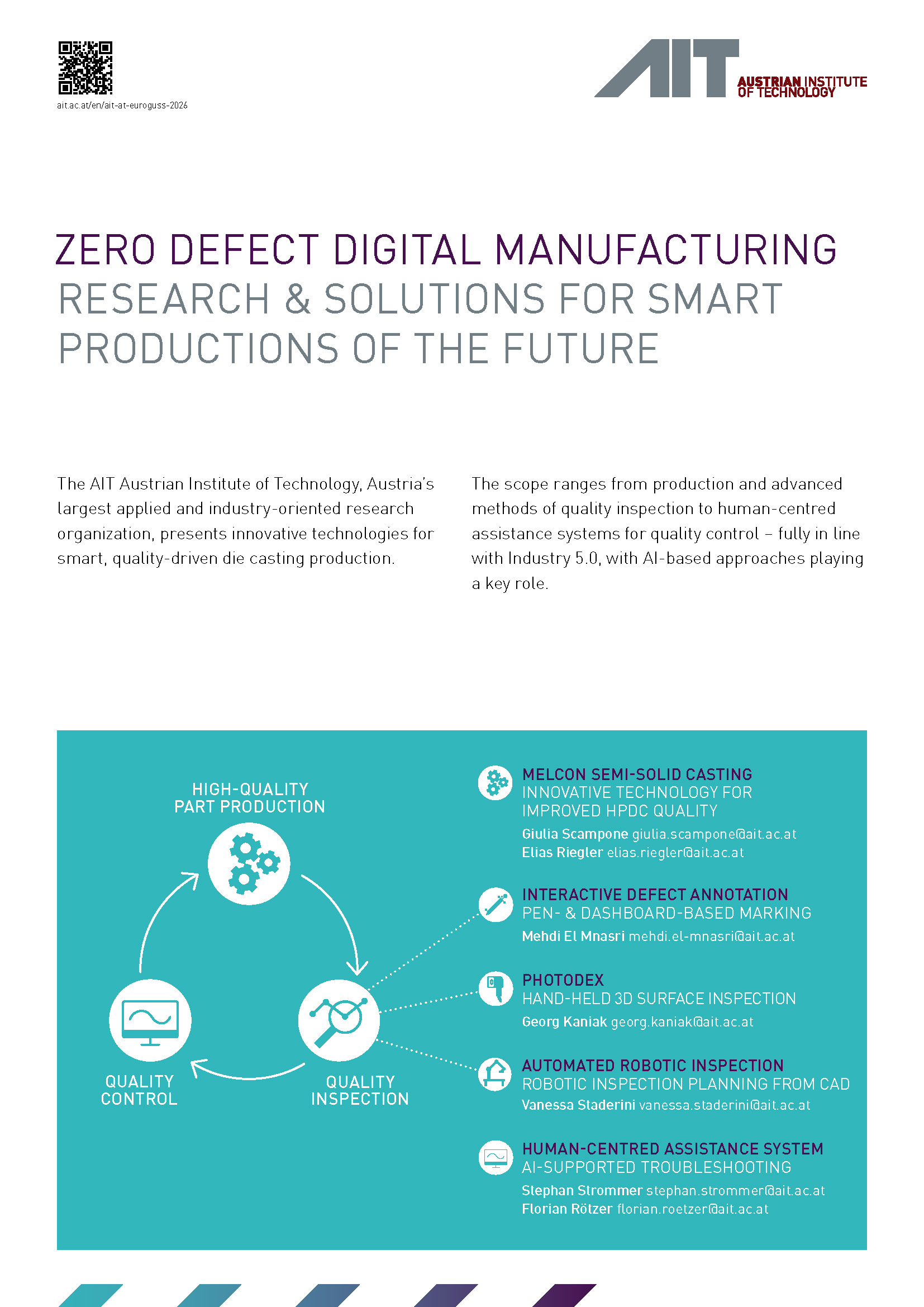Für die Druckguss- und Leichtmetallindustrie bündeln mehrere AIT Center ihre komplementären Kompetenzen zu einem ganzheitlichen Lösungsansatz – von der Bauteilherstellung über Inspektion und Qualitätskontrolle bis hin zur nutzerzentrierten Assistenz und interaktiven Defekt Annotation im Produktionsumfeld.
