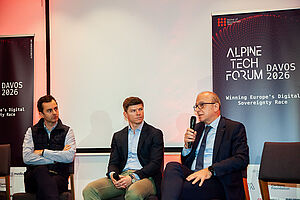 Im Rahmen des Weltwirtschaftsforums 2026 in Davos, organisierte ADVANTAGE AUSTRIA Switzerland am 19. Jänner 2026 das 6. Alpine Tech Forum unter dem Motto „Winning Europe’s Digital Sovereignty Race“. Helmut Leopold, Chairman des Gaia-X Hub Austria, diskutierte auf Einladung des Forums auf dem Panel zu Thema „Digital Sovereignty – Best Practices aus Österreich“ gemeinsam mit den renommierten Wirtschaftsexperten und Gründern Martin Kaswurm und Christian Niedermueller über wirtschaftliche, geopolitische und technologische Herausforderungen im Kontext der Europäischen Souveränität. Moderiert wurde die Diskussion von Patrick Sagmeister, Leiter ADVANTAGE AUSTRIA Switzerland.