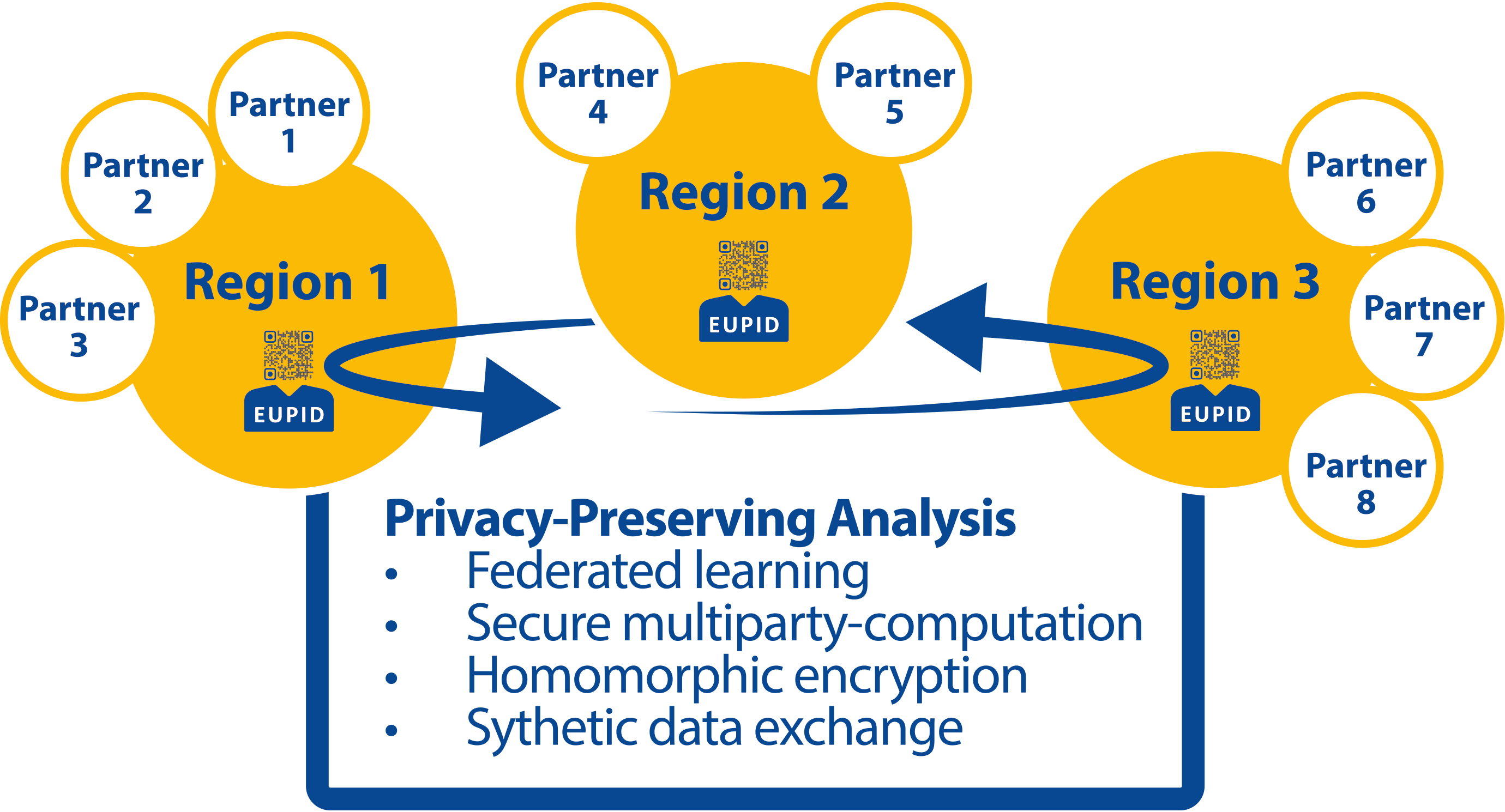 Wir entwickeln Infrastrukturen, die verschiedene Arten von KI unter Wahrung der Privatsphäre ermöglichen, darunter PPRL und Federated Learning. Darüber hinaus erforschen wir gemeinsam mit unseren Partnern auch andere Technologien , darunter Secure Multi-Party Computation (SMPC), synthetische Datengenerierung, homomorphe Verschlüsselung usw.